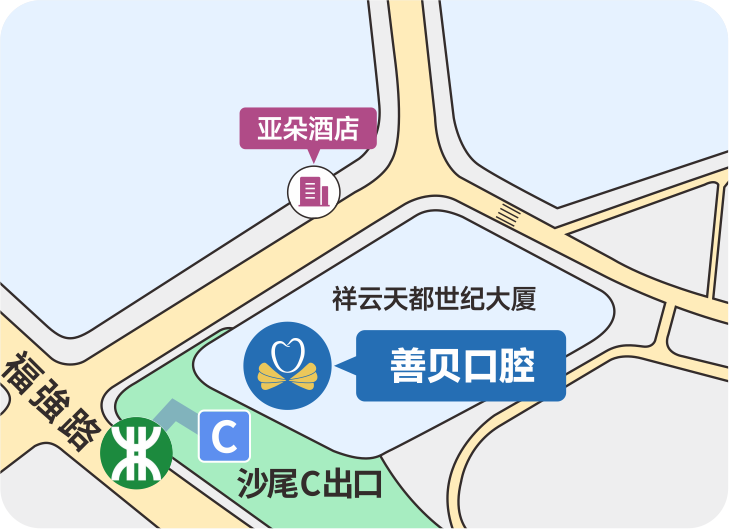 善貝口腔位於深圳市福田區祥雲天都世紀大廈A棟1至2層,距離深圳地鐵7號線沙尾站C出口只需步行1-2分鐘。從落馬洲口岸過關後,只需4個站即可直達,非常方便港人周末北上順道護齒。